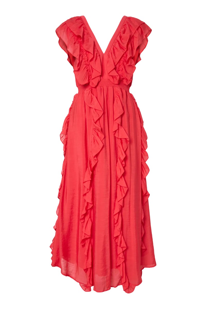 Fineste flæsekjole i en flot rosenrød farve fra Y.A.S er landet. Perfekt til forårets og sommerens mange festligheder. Giver et elegant look med dens længde og mange flæser der blafrer i vinden.