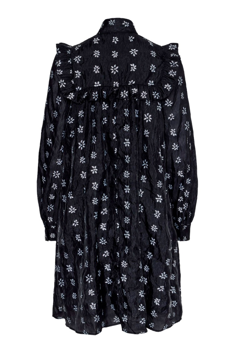 Wauw virkelig smuk festkjole fra Y.A.S! En smuk sort nuance med hvidt blomsterprint. Kjolen har en rummelig pasform med masser af volume, derudover er designet med flæsekanter ved halsudskæringen og flot sløjfedetalje! En oplagt festkjole til alle julens fester + samt nytår.