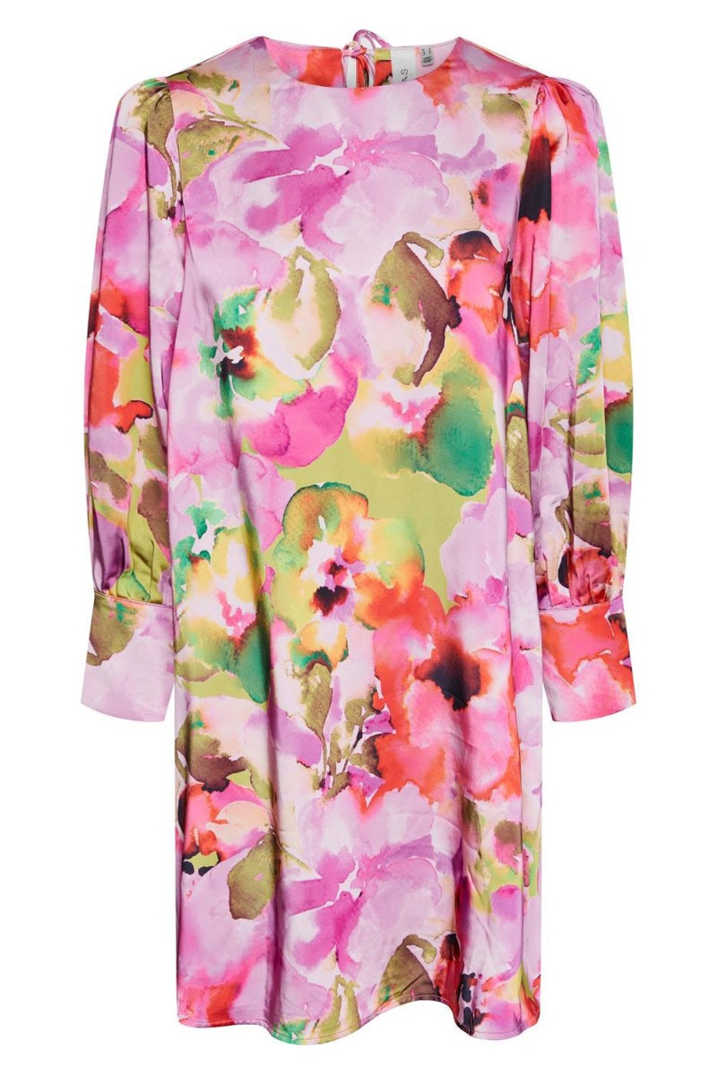Fineste kjole fra Y.A.S i smukke sommerfarver. Kjolen har sløjfedetaljer i nakken og lukkes med knapper ved håndleddet. Kjolen er løs i pasformen og går ud i et A-snit. Den har en lille rynkeffekt ved skuldrene, hvilket giver ærmerne et lille ballonsnit. Den smukkeste kjole til de kommende forårsfester hvis du spørger os!
