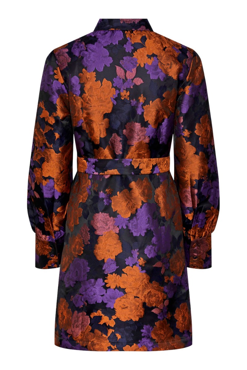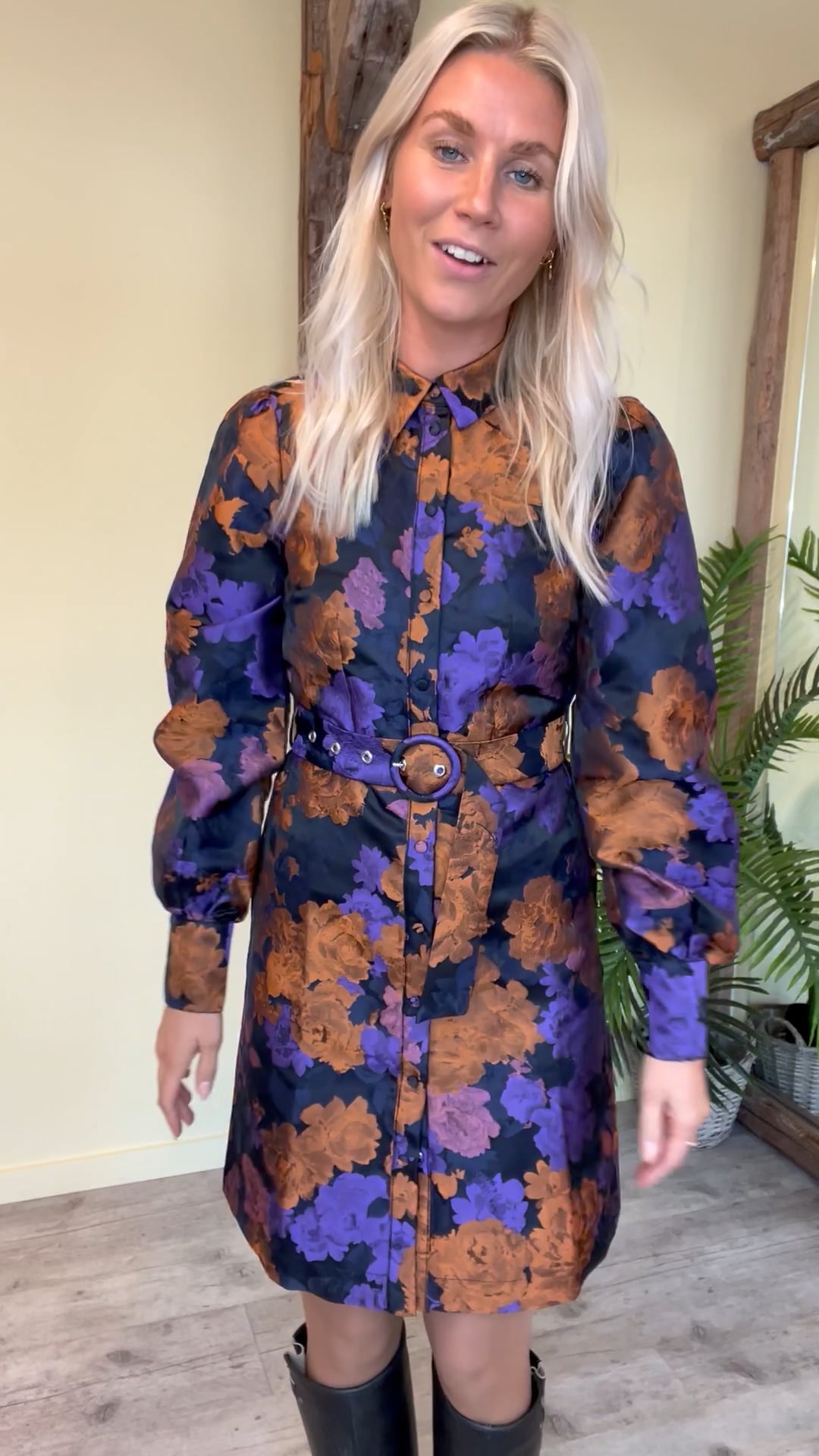 Wauw utrolig smuk og elegant blomsterkjole fra Y.A.S! En feminin kjole i et flot design med shineeffekt og blomsterprint i flotte efterårstoner. Kjolen har et knælangt snit med lange ærmer med knappelukning i bunden af ærmet. Foran er kjolen designet med knapper hele vejen ned, samt skjortekrave og bælte i taljen. Kjolen er så fin til efteråret og perfekt til alle dets fester!
