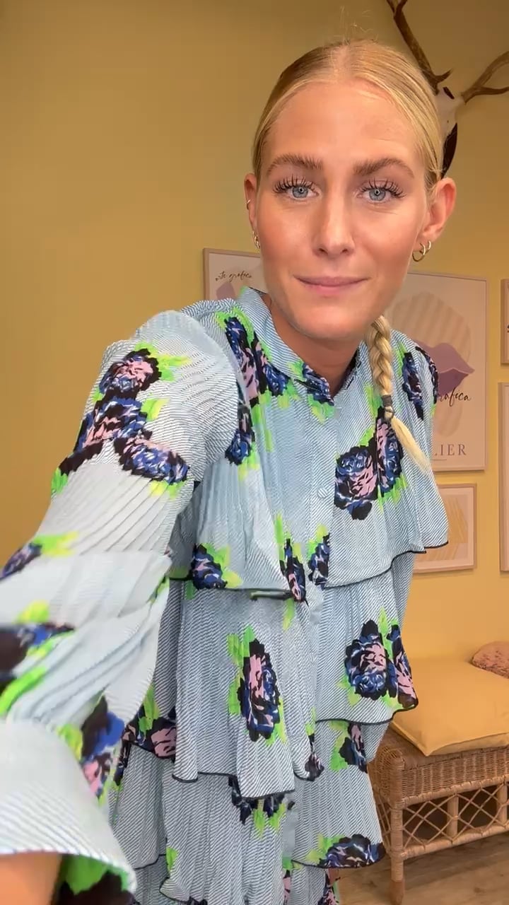 Kjole fra Y.A.S i en smuk blå nuance med blomster i rosa farver. Kjolen er lavet med peplum i fem lag, som falder super flot, når kjolen kommer på. Kjolen er plisseret i stoffet og med gennemgående knaplukning.