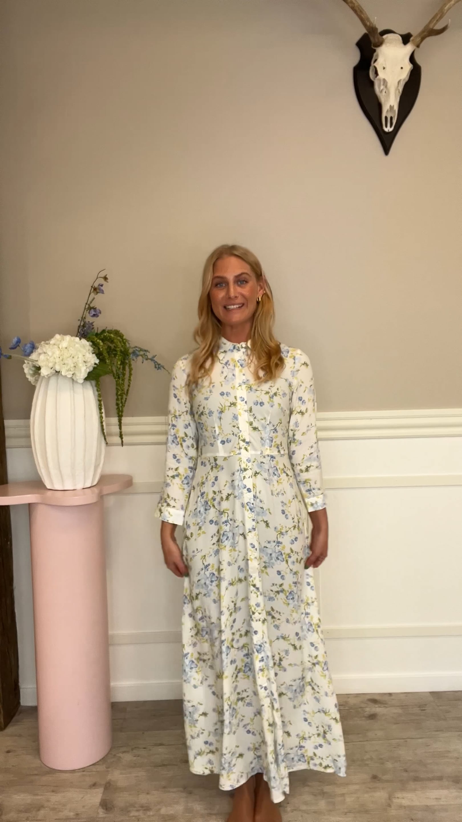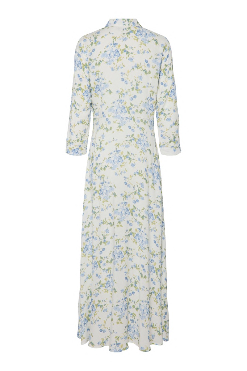 Kjole fra Y.A.S. Denne kjole er lang, med lange ærmer og krave. Den har knaplukning og en behagelig pasform. Kjolen har en hvid baggrundsfarve med blomster i en blå farve. En kjole som er nem at style både til hverdagsbrug og festelig anledninger.