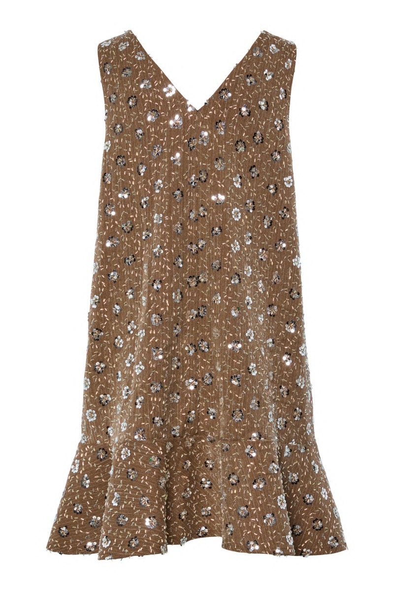En virkelig fin kjole er netop landet fra Y.A.S! Denne kjole er i en smuk og klassisk facon uden ærmer, med en lille kant forneden og V-udskæringer for og bag. Kjolen er i en fin beige farve med de flotteste sølvfarvede palietter, som former små blomster. Kjolen her er altså super festlig, og bestemt oplagt til din næste fest i denne sæson!