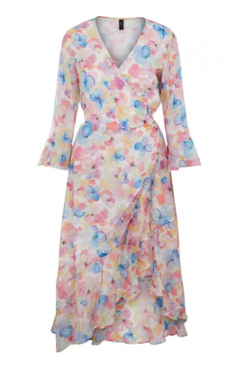 Wauw, en kjole! Denne kjole er helt uimodståelig og den bliver kun smukkere på! Den er med wrap der bindes i siden og skaber en smuk v-udskæring. Bundfarven er rosa med det fineste blomsterprint i pink, blå og gule nuancer. Ærmerne er 3/4 med flæsekant der går igen ned af kjolen. Denne kjole er det oplagte valg til de kommende sommerfester og bryllupper.