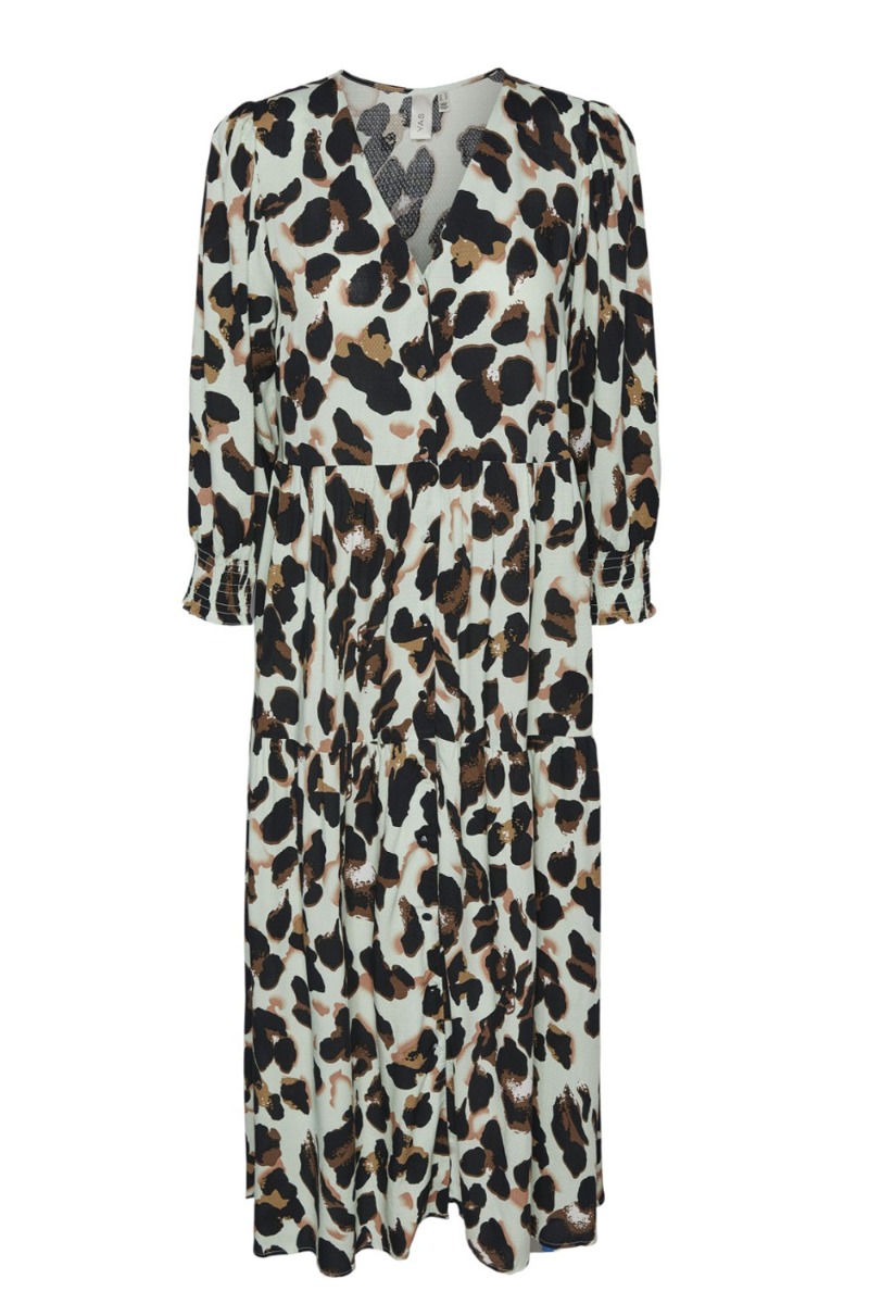 En smuk kjole fra Y.A.S er landet i en mint grøn farve med leo print over. Den er med V hals og 3/4 lange ærmer. Derudover er den løs i underdelen og i en dejlig let kvalitet. Der er knapper foran fra top til bund, dette gør også at den er ammevenlig og og den løse pasform kan også nemt bruges til den tidlige graviditet.