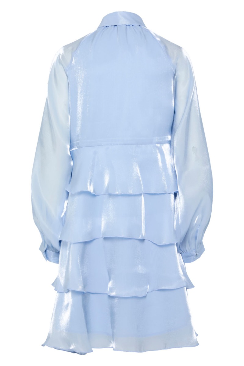 En POPULÆR model fra Y.A.S er kommet i den flotteste lyseblå nuance med shinyeffekt - waaauw. Kjolen er i et fint a-snit med lag-på-lag flæse og bindebånd i kraven der giver en sød sløjfedetalje. Bindebåndet kan nemt tages af hvis ikke man ønsker dette. Style den med en smuk enkel stilet til de kommende forårs og sommerfester.