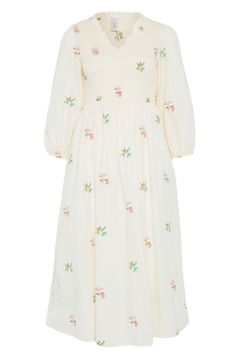 Fineste sommerkjole fra Y.A.S med lys baggrund og sødeste enkle blomsterprint i flere skønne farver. Kjolen har et fint a-snit med tætsiddende smock ved barmen og 3/4 ærmer der afsluttes med elastik i enden. Style med en stilet eller sandal alt efter anledning.