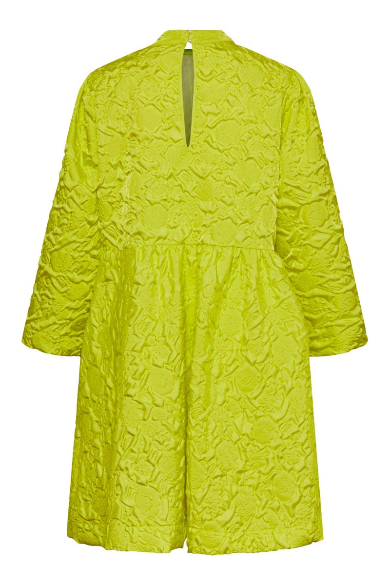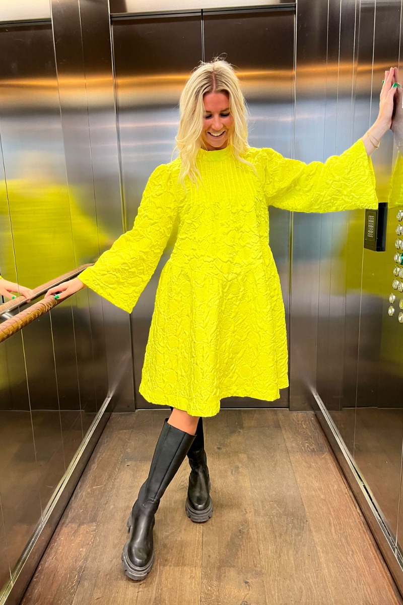 WAUW piger se lige den sejeste kjole fra Y.A.S i den cooleste neongule farve. Kjolen har en løs og rummelig pasform med store ærmer. Den har en høj kinakrave som giver en flot detalje på kjolens udskæring og en tydelig syning i taljen som giver en sej skørteeffekt. Kjolens print er med 3D effekt i stoffet og det ser SÅ SEJT ud!