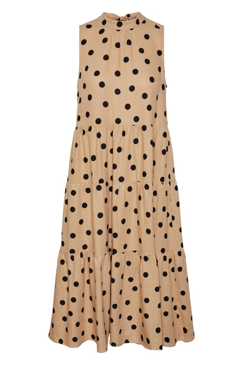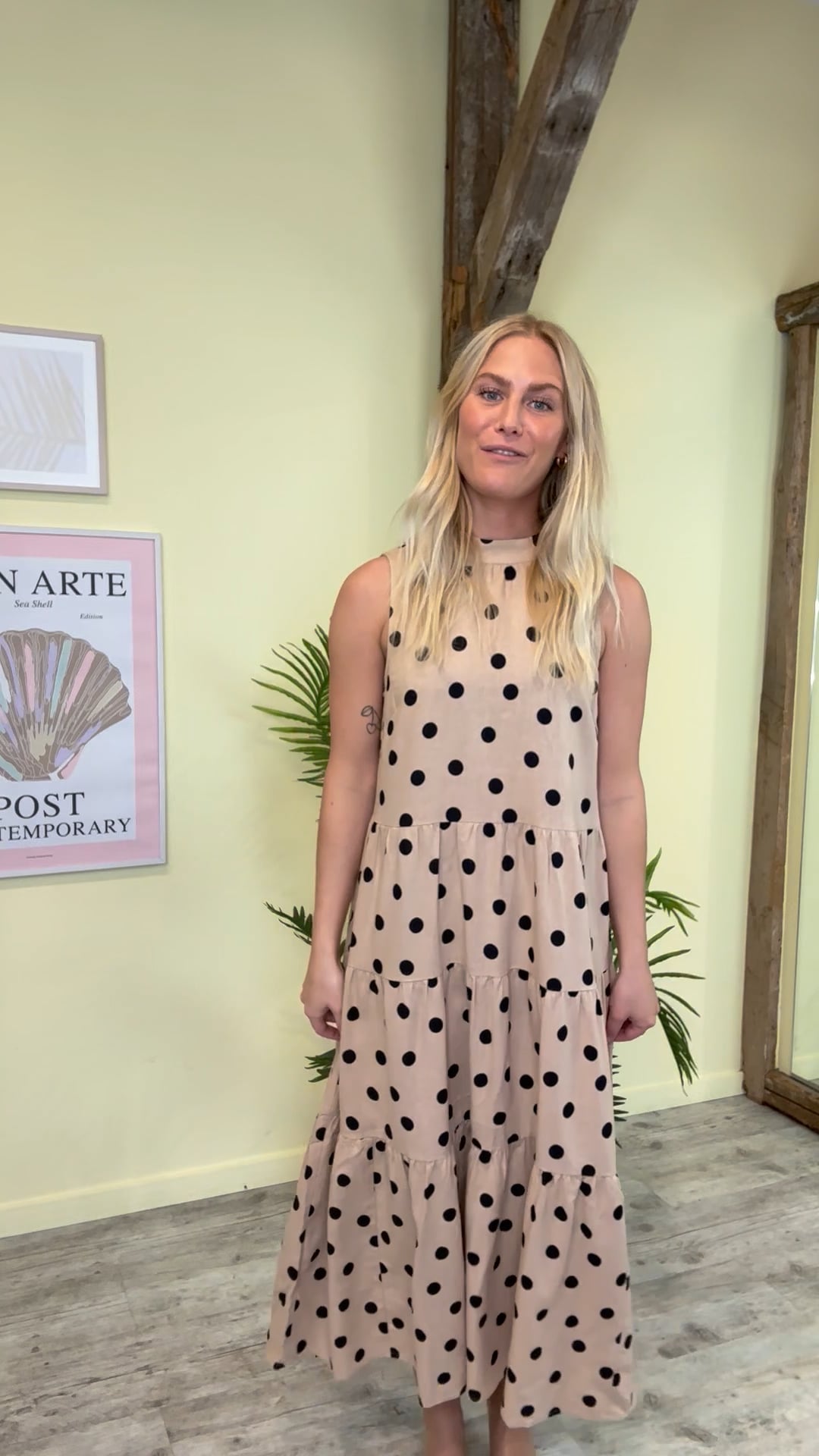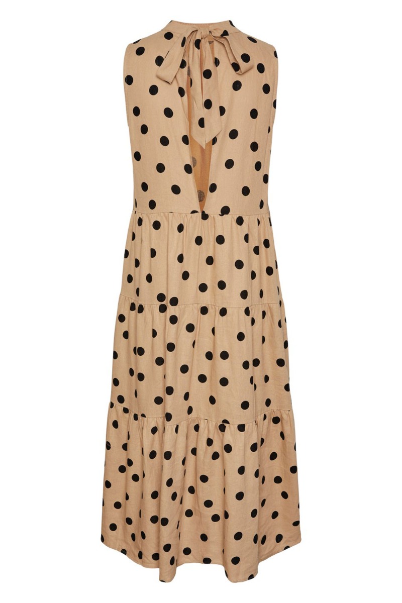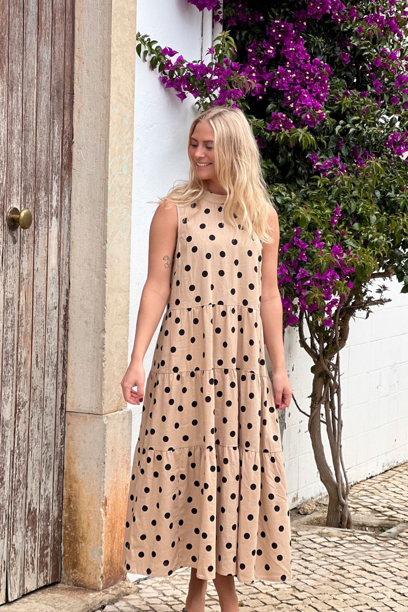 Sødeste prikket kjole fra Y.A.S med beige bundfarve og sorte prikker. Kjolen er i et rummeligt snit med peplum der falder flot løst i et klassisk a-snit der bare klæder utrolig mange kropstyper. Kjolen lukkes i nakken med knaplukning og er foret indvendigt. Den er i en velkendt populær model, så vent ikke for længe hvis du skal nå at have denne smukke sag ind i din sommergarderobe.