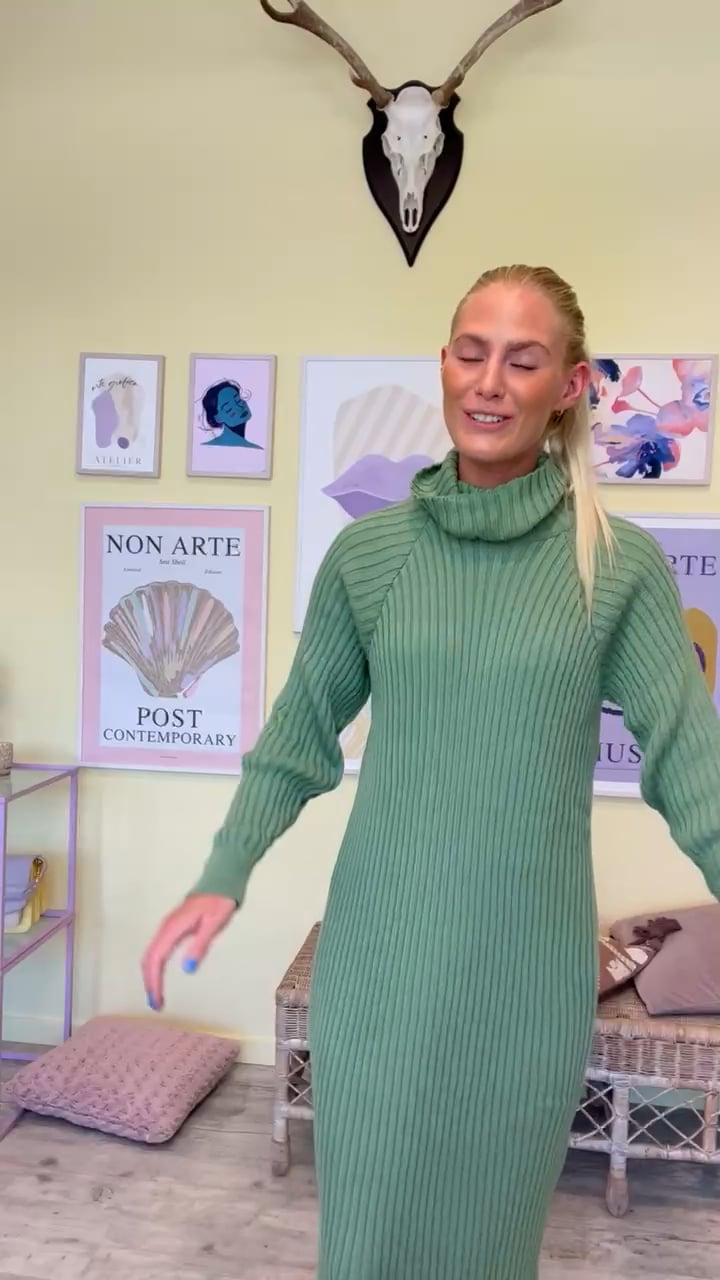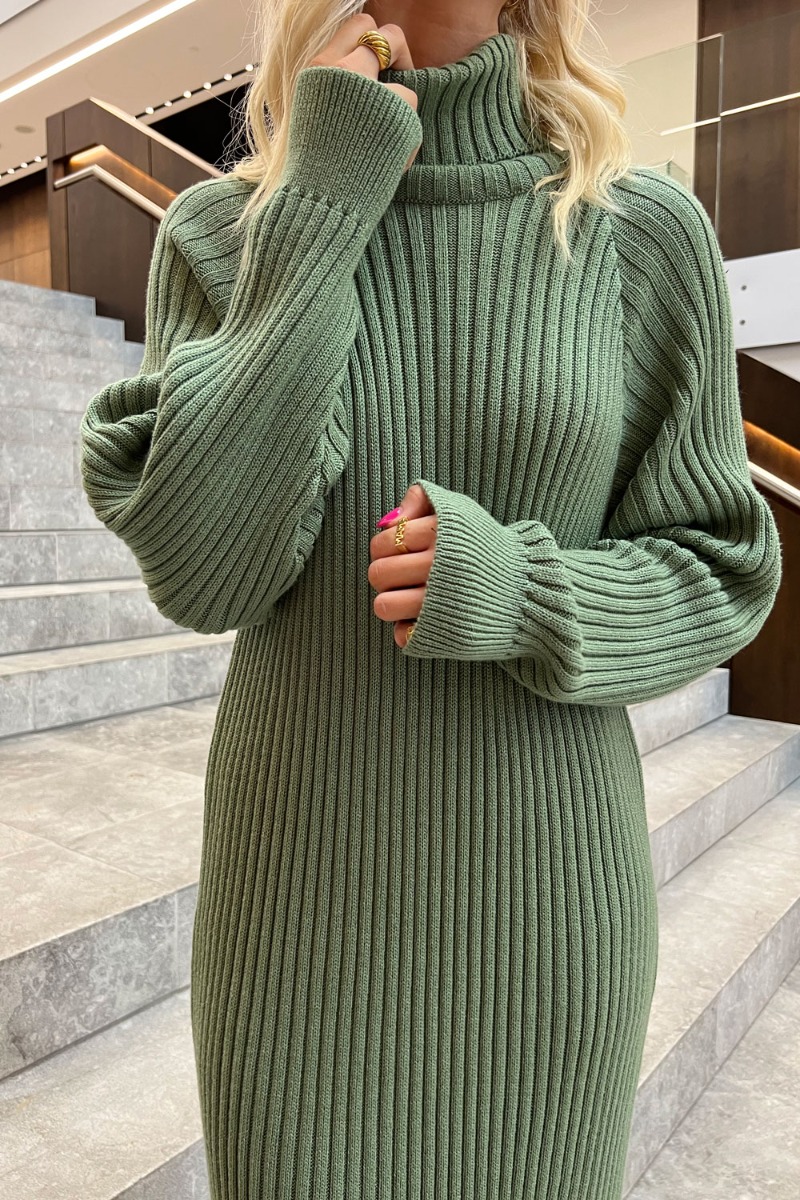 Y.A.S har selvfølgelig lavet en ny strik kjole i ribstrik i den flotteste støvet grønne farve. Kjolen er med rullekrave og tættere ribkant ved ærmene, så den lige slutter ordentlig til her. Ellers er modellen lang og føles næsten som at have en sovepose på. Perfekt til efteråret og vinteren.