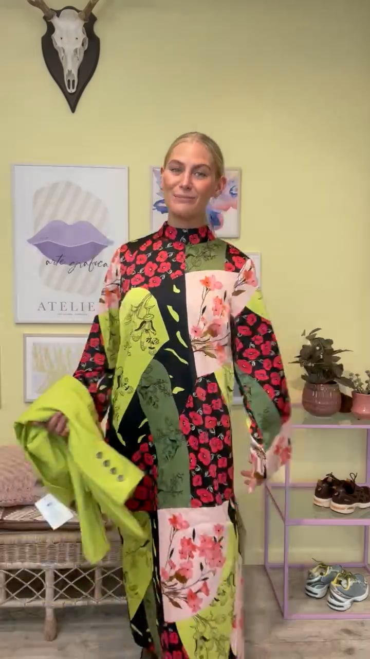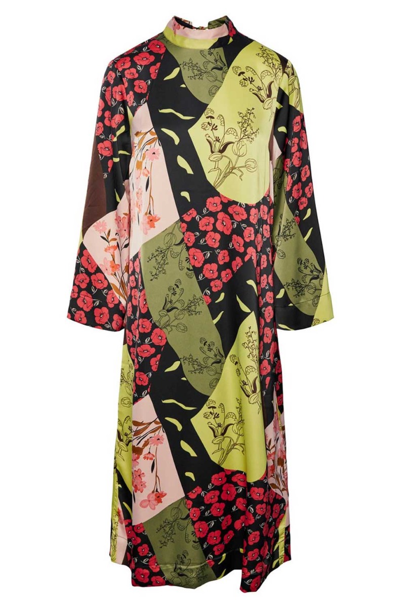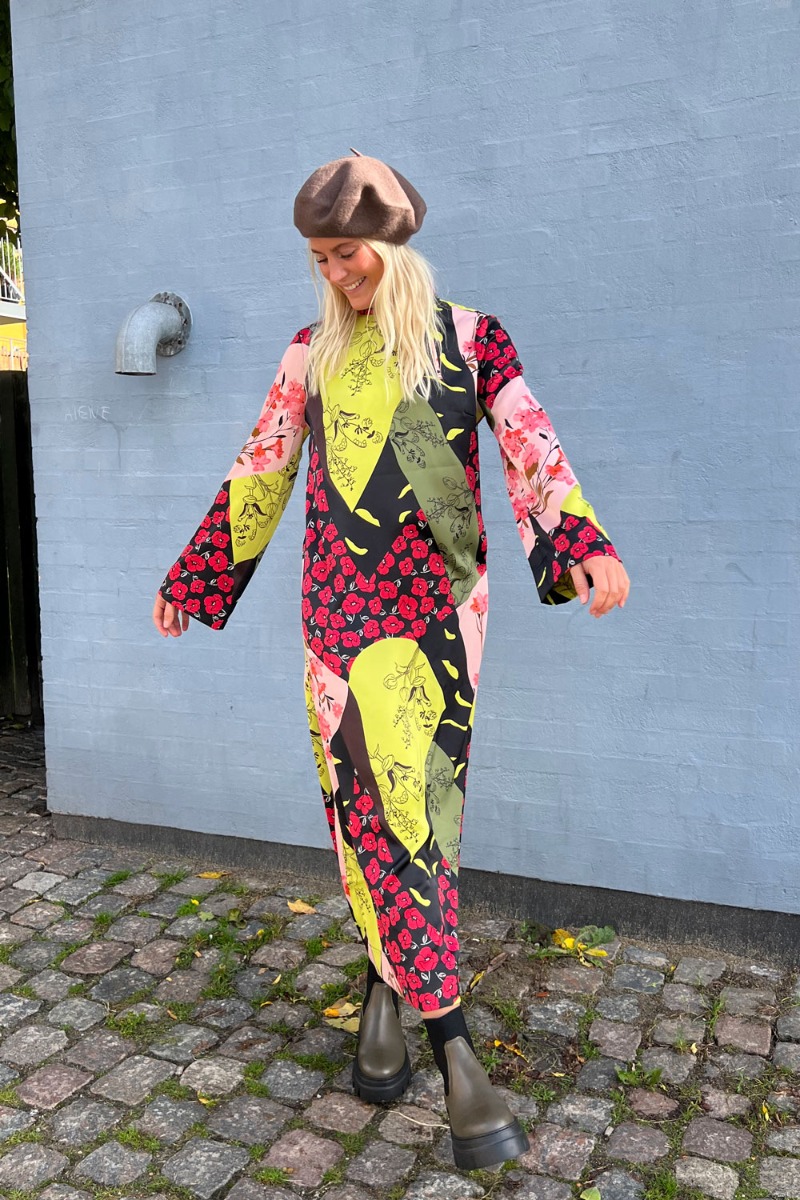 En helt vidunderlig smuk kjole fra Y.A.S i det fineste japanske mønster med en glat shineoverflade. Kjolen er lang i en rummelig løs pasform med snøre i nakken og lange ærmer. Kjolen vil passe perfekt til de smukke fester og bryllupper men kan samtidig bruges med en rå støvle.