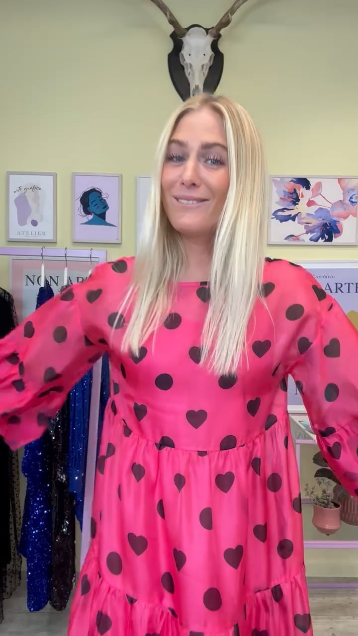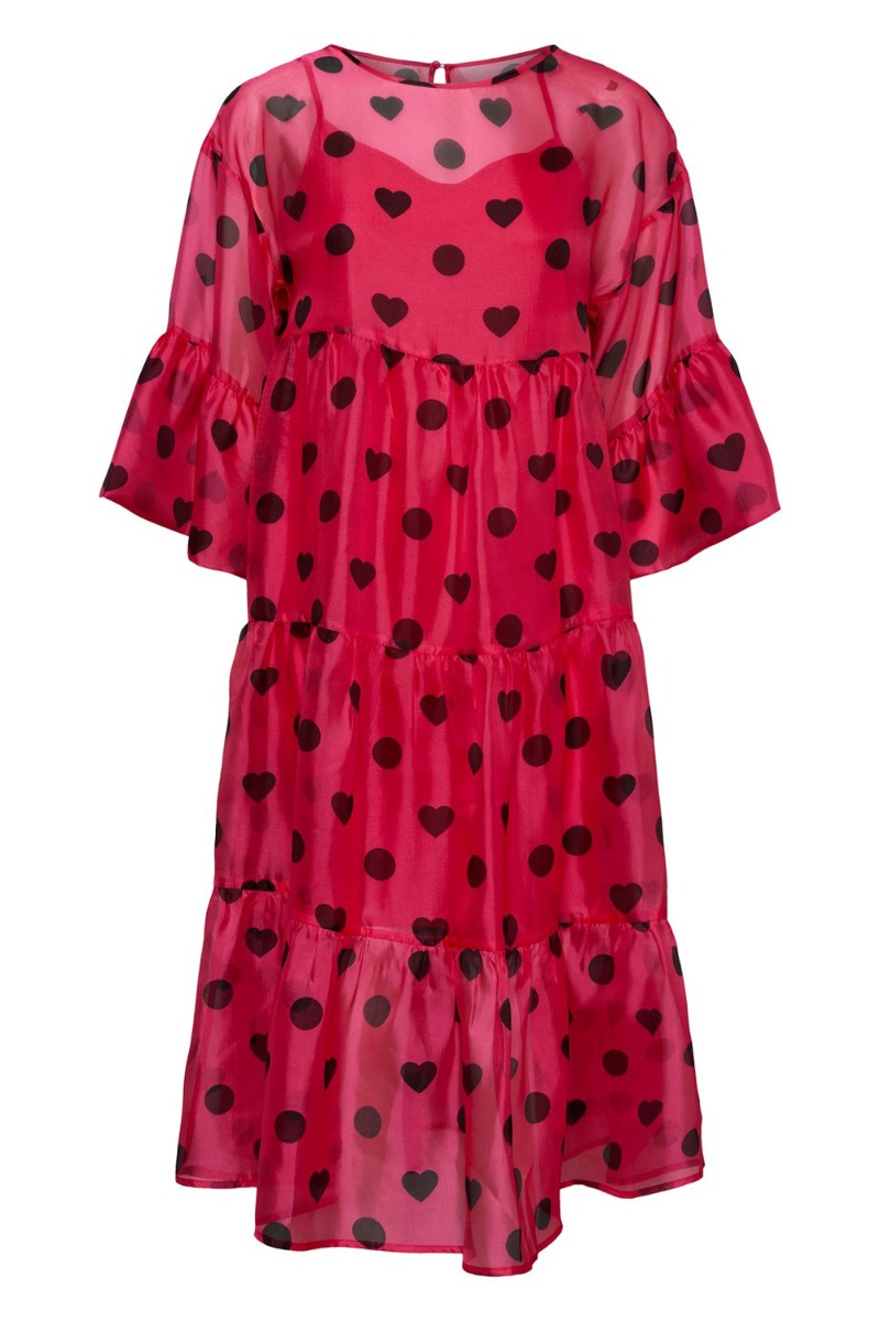 Hvem sagde FEST?? Tjek lige den smukkeste Y.A.S kjole i PINK med det fineste sorte hjerteprint. Kjolen er lavet i et let gennemsigtigt materiale der har medfølgende underkjole og rund halsudskæring. Ærmerne er cropped med flæse i bunden der giver den fineste feminine detalje. Kjolen har ekstra længde hvilket gør den så fin og elegant. Brug den også gerne til hverdag med en rå støvle.