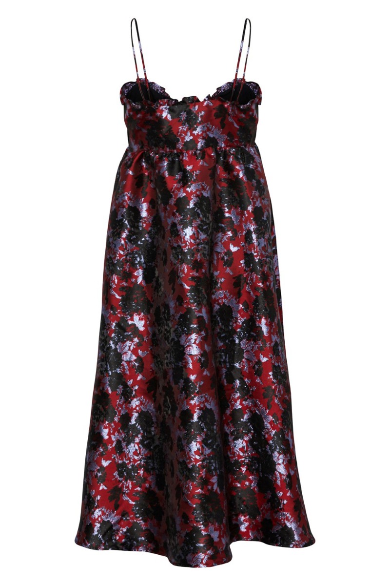 Er du klar til de kommende julefrokoster? Ellers bliver du det hvertfald af denne smukke kjole fra Y.A.S. Bundfarven er mørkerød med et smukt blåligt og sort blomsterprint med glimmereffekt. Kjolen har tynde justerbare stropper med flæser langs kanten og en sød pasform der giver en rigtig prinsessefølelese!