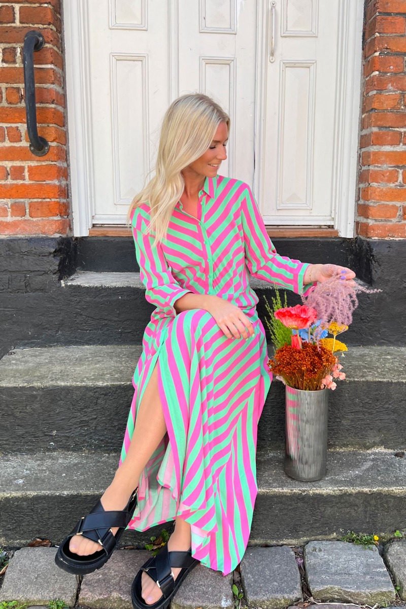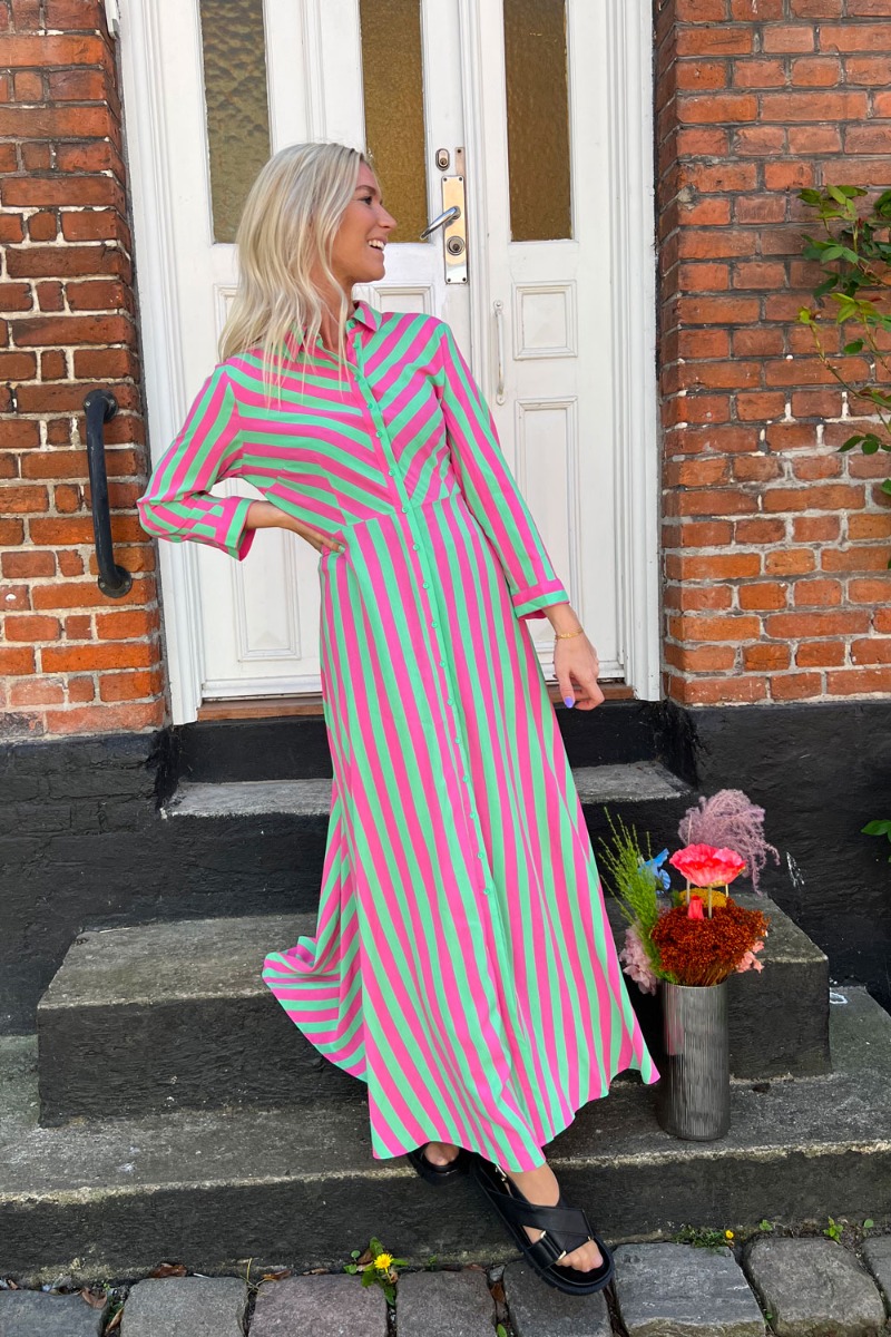 En drøm af en kjole fra Y.A.S man virkelig skal eje hvis du spørger os! Kjolen er designet i et helt let luftigt materiale der kan styles til foråret og sommeren. Den er gulvlang i en feminin pasform der har en tydelig syning ved taljen. Kjolen lukkes med knapper hele vejen ned foran og har 3/4 ærmer.