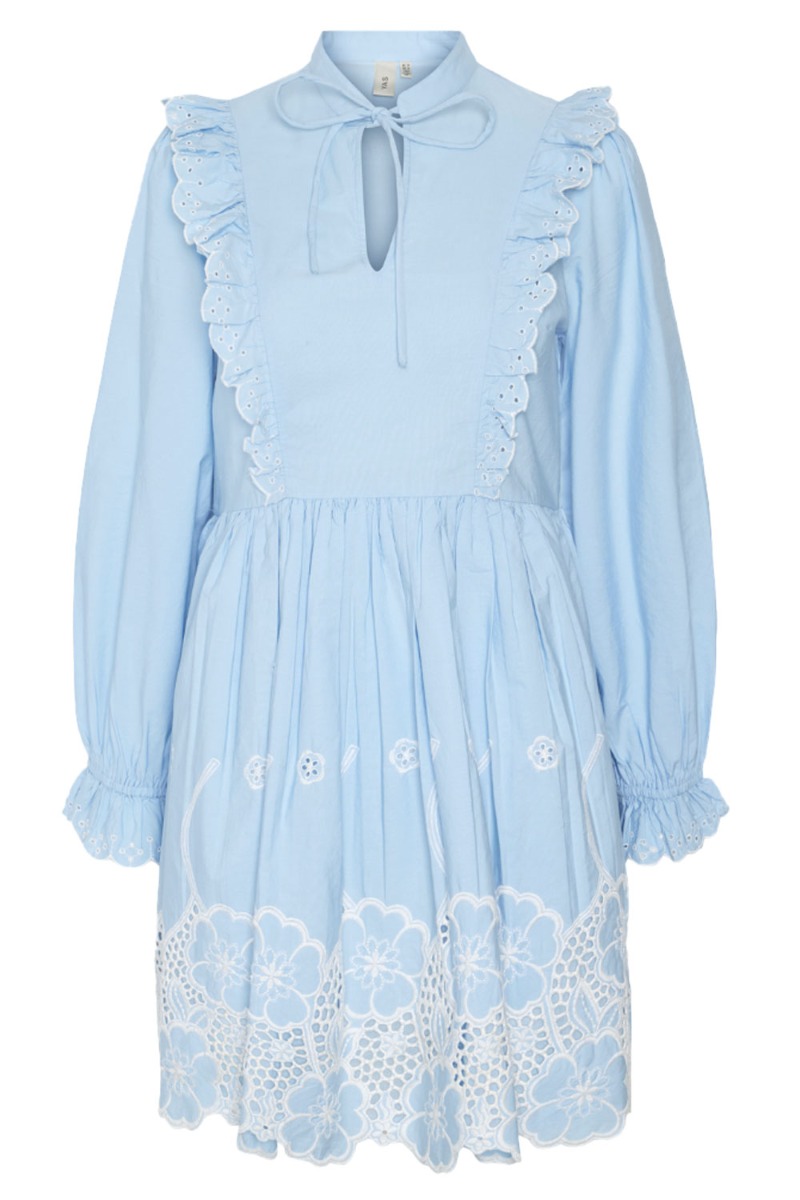 En virkelig smuk og sød kjole fra Y.A.S der er oplagt til alle sommerfesterne. Kjolen har det fineste feminine snit med en tydelig syning ved taljen der giver en sød to-delt-effekt. Den har små fine detaljer med hvide broderinger der giver en flot kontrast. Kjolens lange ærmer afsluttes med en flæsedetalje og lukkes i halsen med snøre.