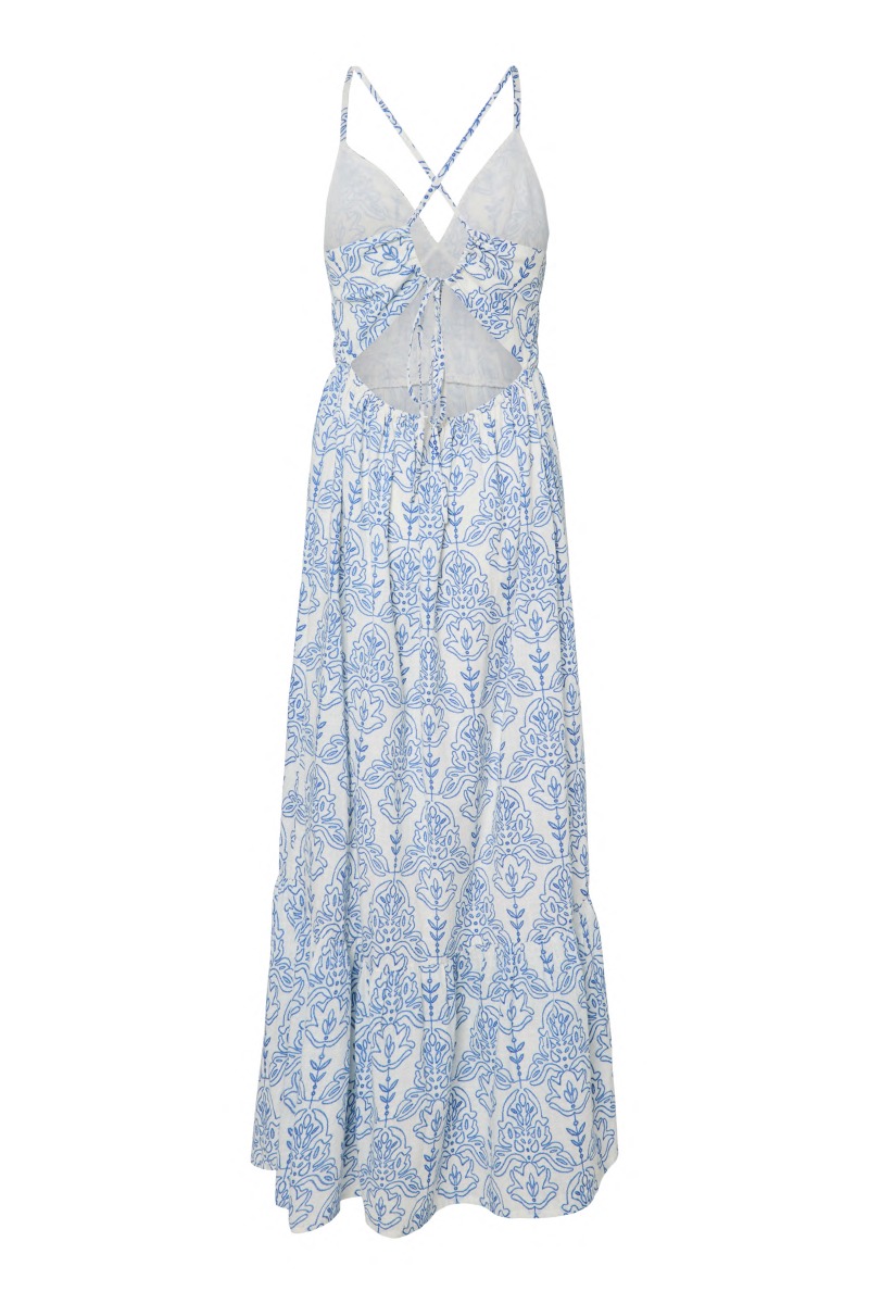 En sød sommerkjole fra Y.A.S. Kjolen har en fin længde, som går ned til anklerne. Den har et fint design på ryggen og et smart mønster. Brug den til de varme sommerdage, sommerfester, ferie m.m.