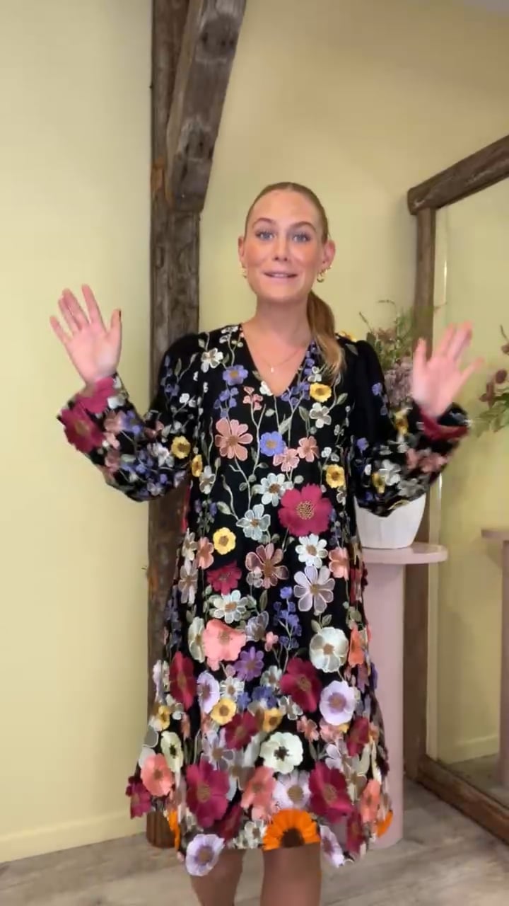Den smukkeste kjole fra Y.A.S! Denne kjole har en sort baggrundsfarve med broderede blomster i alle farver. Kjolen har v-udskæring og er altså bare et oplagt valg til alverdens fester og begivenheder.