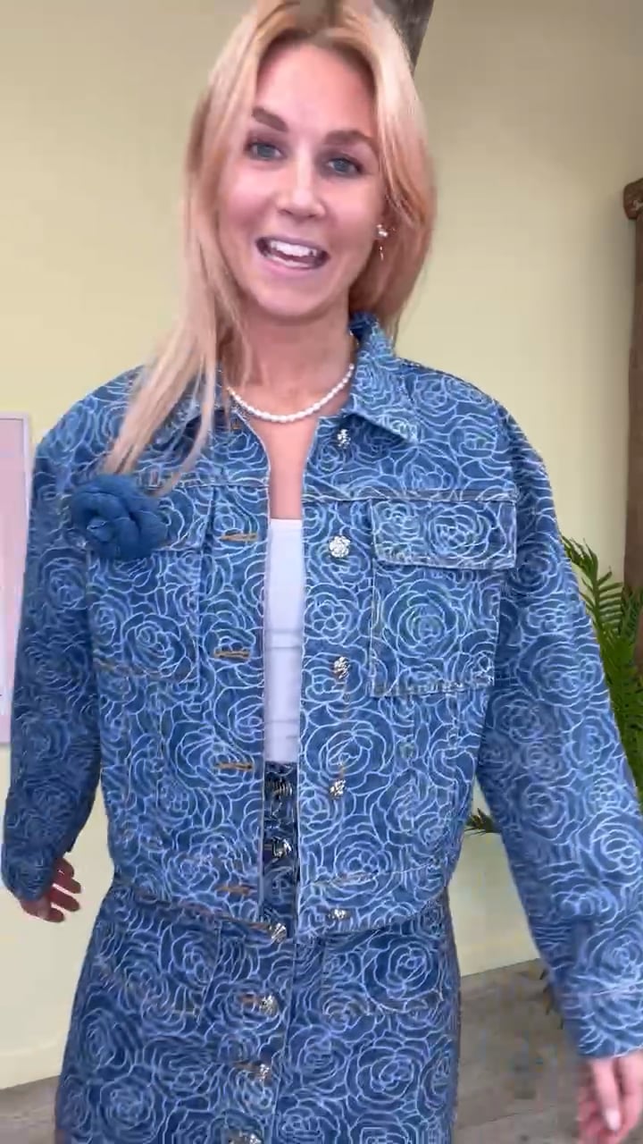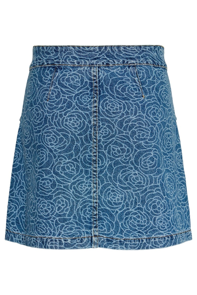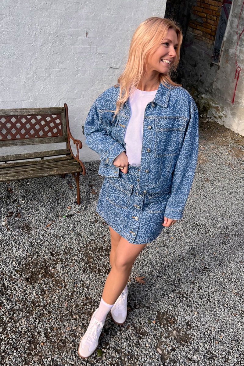 Den sejeste nederdel fra YAS i et denim look. Nederdelen er med et blomstrede mønster og de fineste sølv blomsterknapper. Der er lommer foran, som en fin ekstra detalje. Style nederdelen med den matchende jakke til, for et fuldendt cool denimlook.