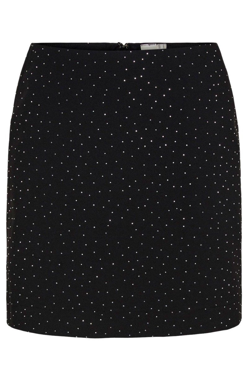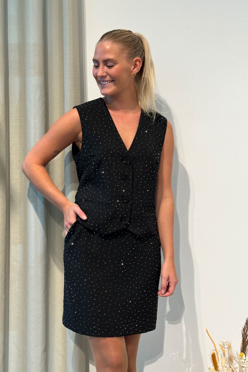 Virkelig sej miniskirt fra Y.A.S! En klassisk sort nederdel med højtaljet fit, skjult lynlås og pyntet med små glitrende sten. Den er oplagt at style til den matchende vest for et fuldendt look, men virkelig også cool at style til en oversized blazer eller strik.