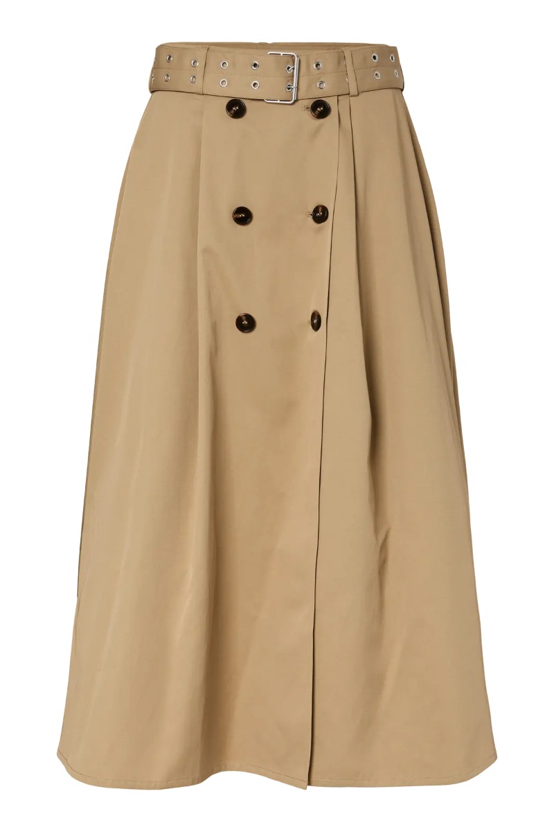 Stilfuld nederdel fra Y.A.S i en flotlysebrun farve. perfekt til foråret med dens lange længde og flotte detaæje med bælte og knapper foran.