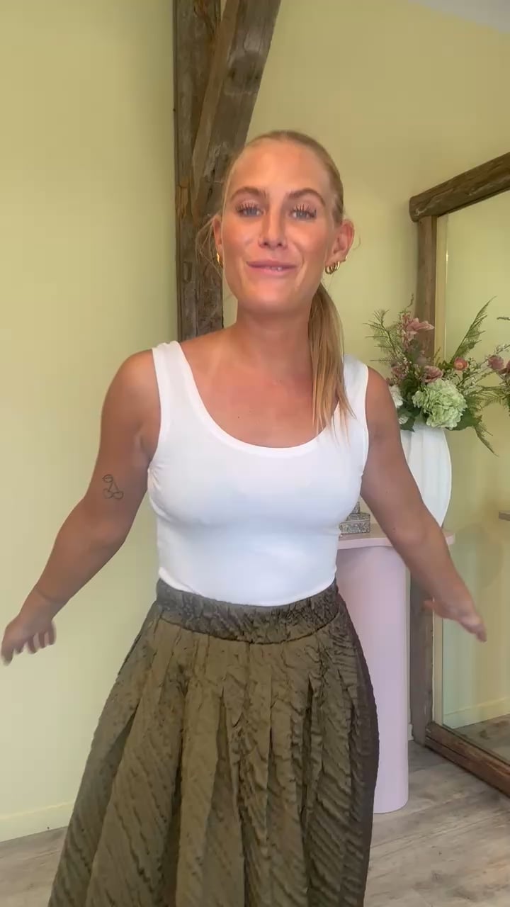Den fineste nederdel er landet fra Y.A.S! Denne nederdel har et bredt A-snit, som virkelig kommer flot til udtryk ved de folder, som er syet ind i nederdelen. Dette gør samtidig, at den altså bare falder super flot fra taljeelastikken og ned.