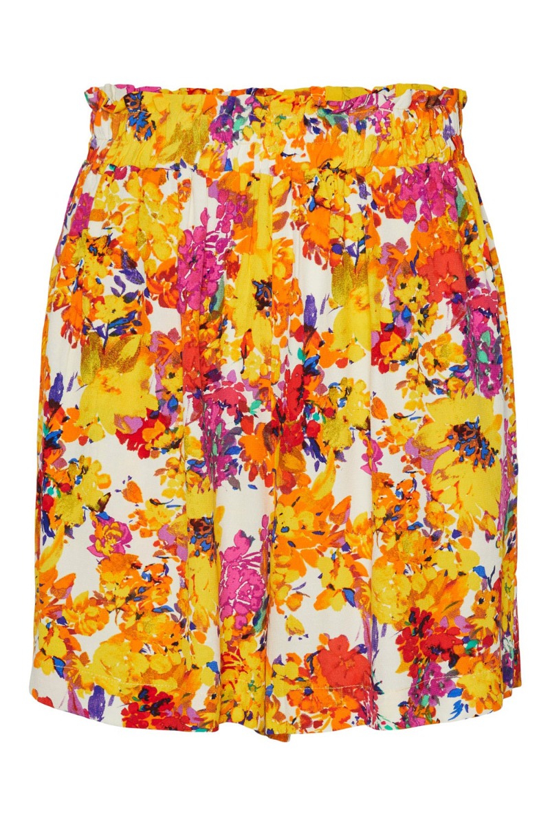 Fineste sommershorts fra Y.A.S med matchende skjorte til. Bundfarven er lys med det flotteste blomsterprint i gule, blå, røde og lilla farver. Shortsene har en super god længde i et let løst materiale med en bred smock elastikkant i livet og sidelommer.