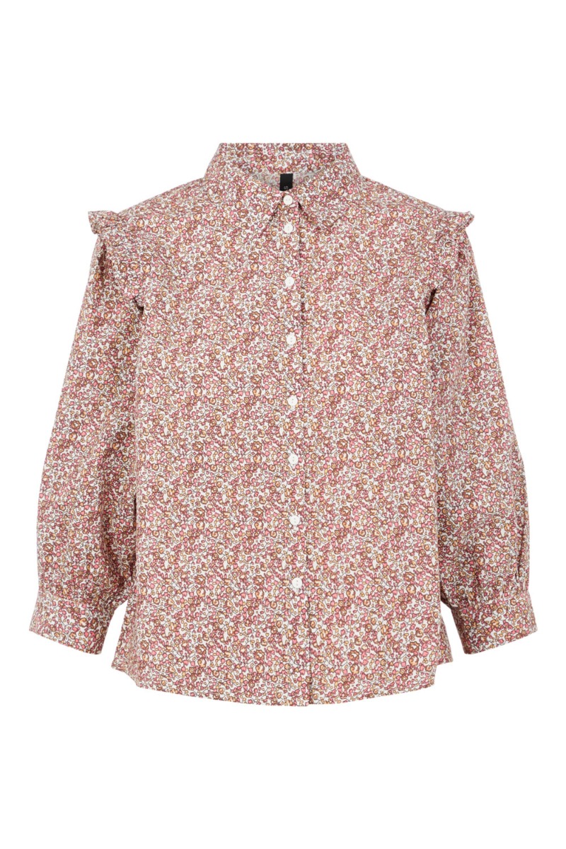 Sødeste skjorte fra Y.A.S. Bundfarven er hvid med et grafisk blomsterprint i rosa og brune nuancer. Modellen er rummelig med stofbetrukket knapper foran og en lille krave. Den er designet med feminine flæsedetaljer ved skulderen og lukkes ved håndleddet med en enkelt knap der giver et lille ballon-snit. Style den til et par lyse denim jeans.