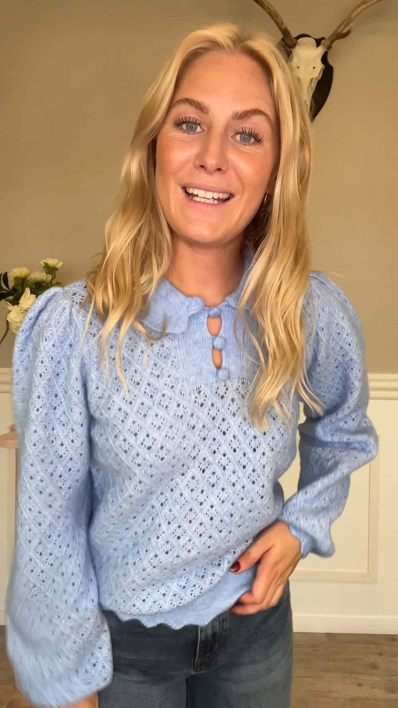 Denne strik fra Y.A.S er lavet i den fineste strik med et flot mønster, som godt kan være lidt gennemsigtigt - derfor anbefaler vi at man bruger denne med en top under. Den har en løs pasform, ballonærmer og en lille krave med knapper. Style den både til nederdel, shorts eller jeans!
