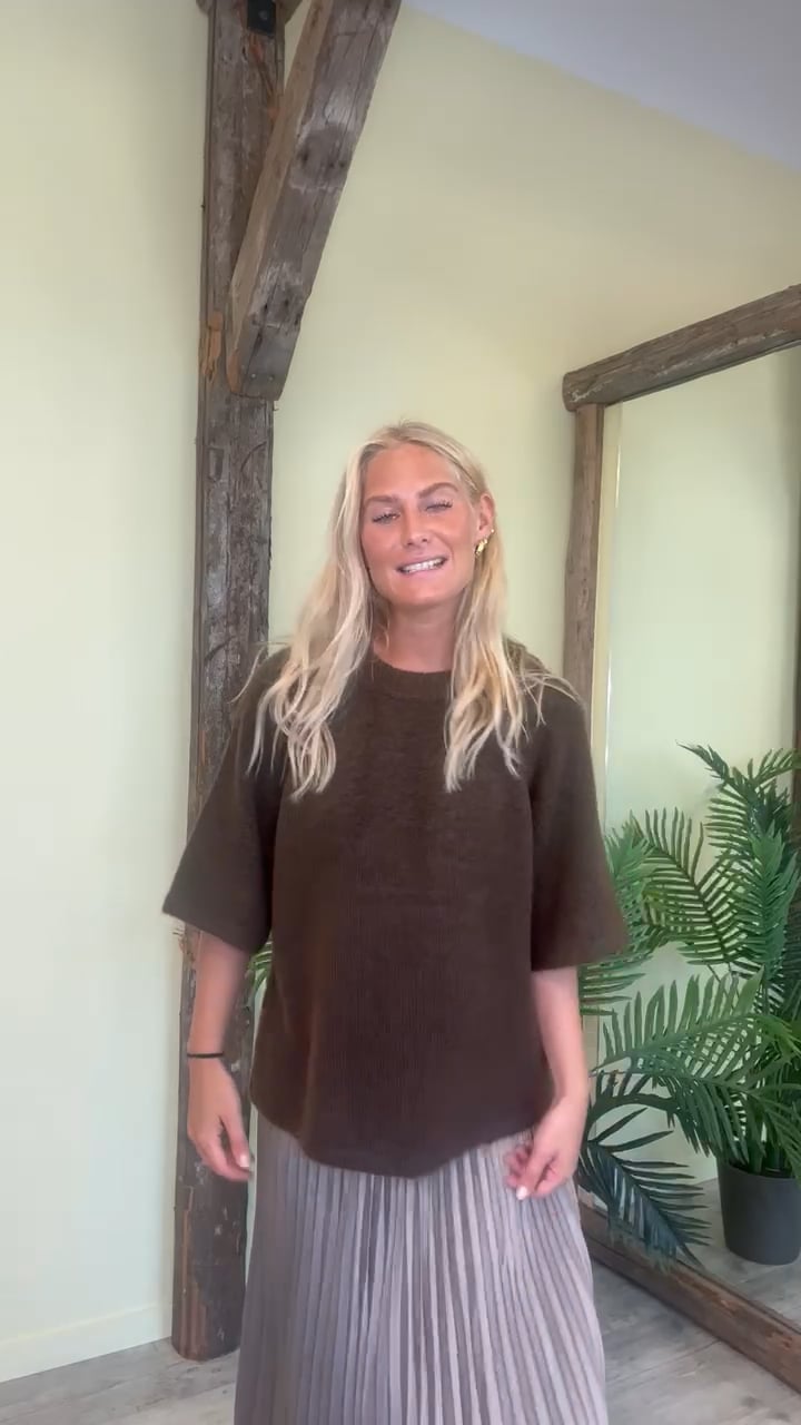 En meget smuk strik fra Y.A.S med korte ærmer og en flot burn farve. Den er løs i pasformen og dejlig blød i kvaliteten. Derudover er den nem at bruge til hverdag med en af dine favorit bukser. Den findes også i en hvid farve og perfekt neutral i farven.