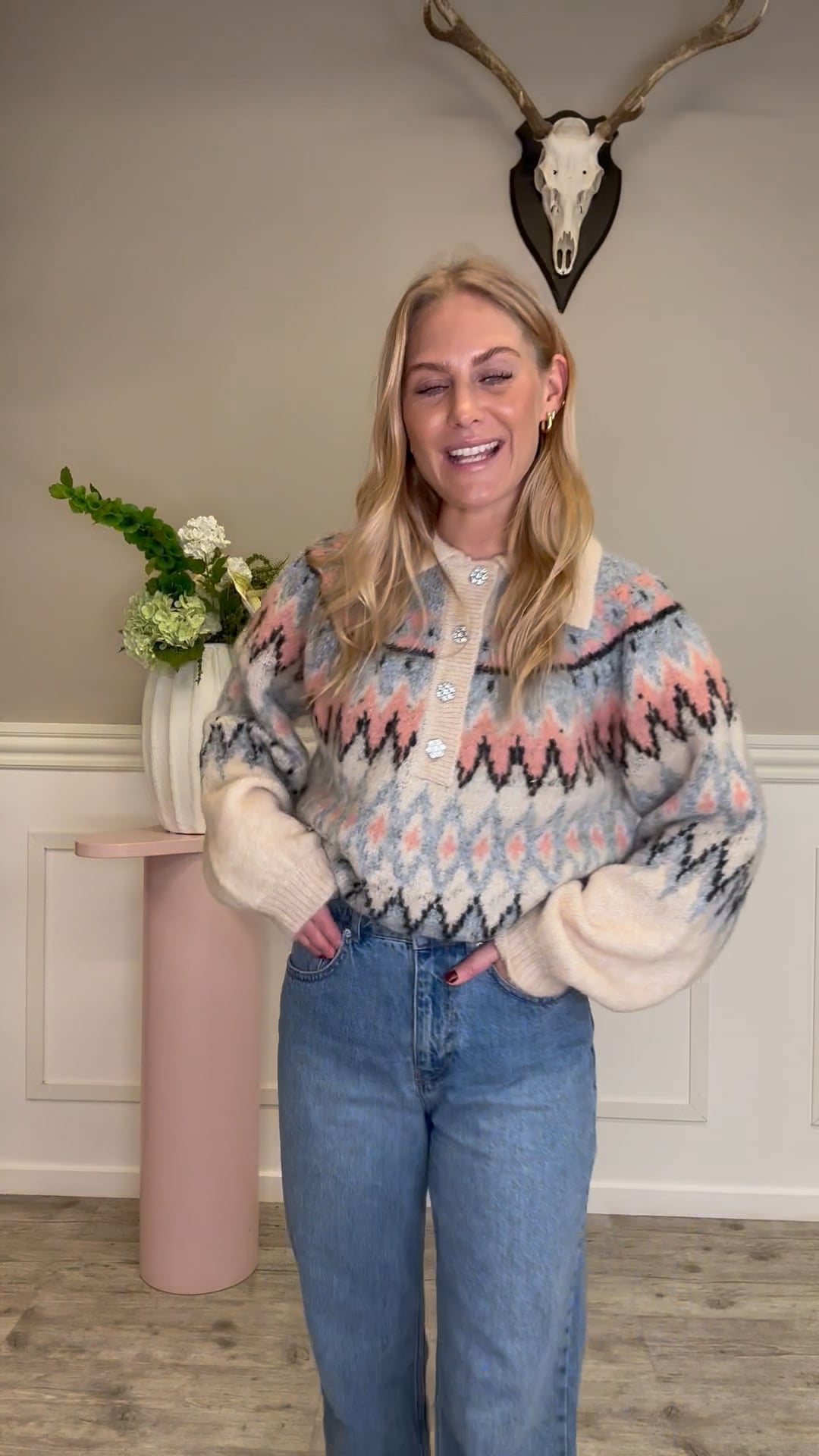 En virkelig fin og lækker strik fra Y.A.S i det flotteste mønster! Denne strik har flotte glimtende knapper i halsen og en lille krave. Strikken har ballonærmer og en løs pasform, så den er super behagelig at have på!