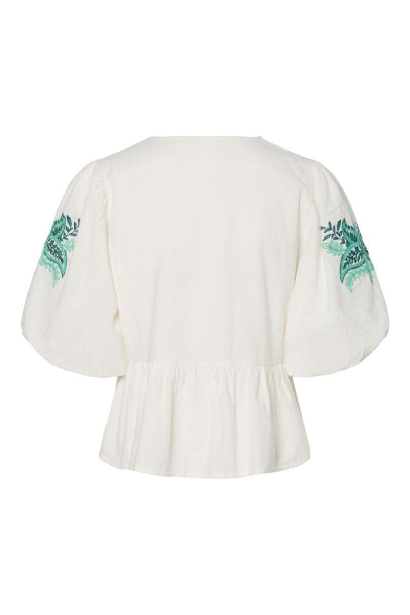 Den fineste t-shirt fra Y.A.S. Den har en feminin v-udskæring og brede ærmer. T-shirten har et fint desing og går til stort set alt! Brug den både til hverdag eller en sommerfest, evt. med en nederdel.