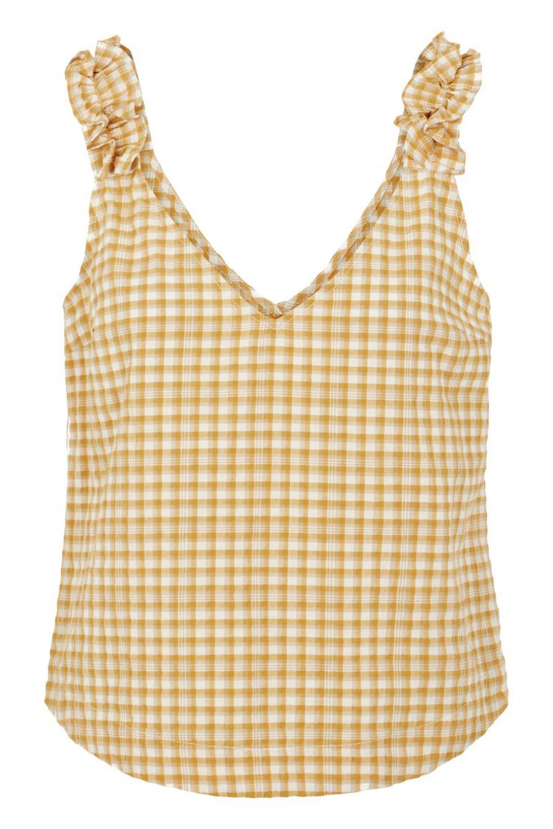 Super sød top fra Y.A.S med de fineste flæsestropper. Toppen har en lille v-udskæring og runding i bunden der giver et fint snit. Style den til dine denim jeans eller de matchende shorts for et rigtig skønt sommersæt.