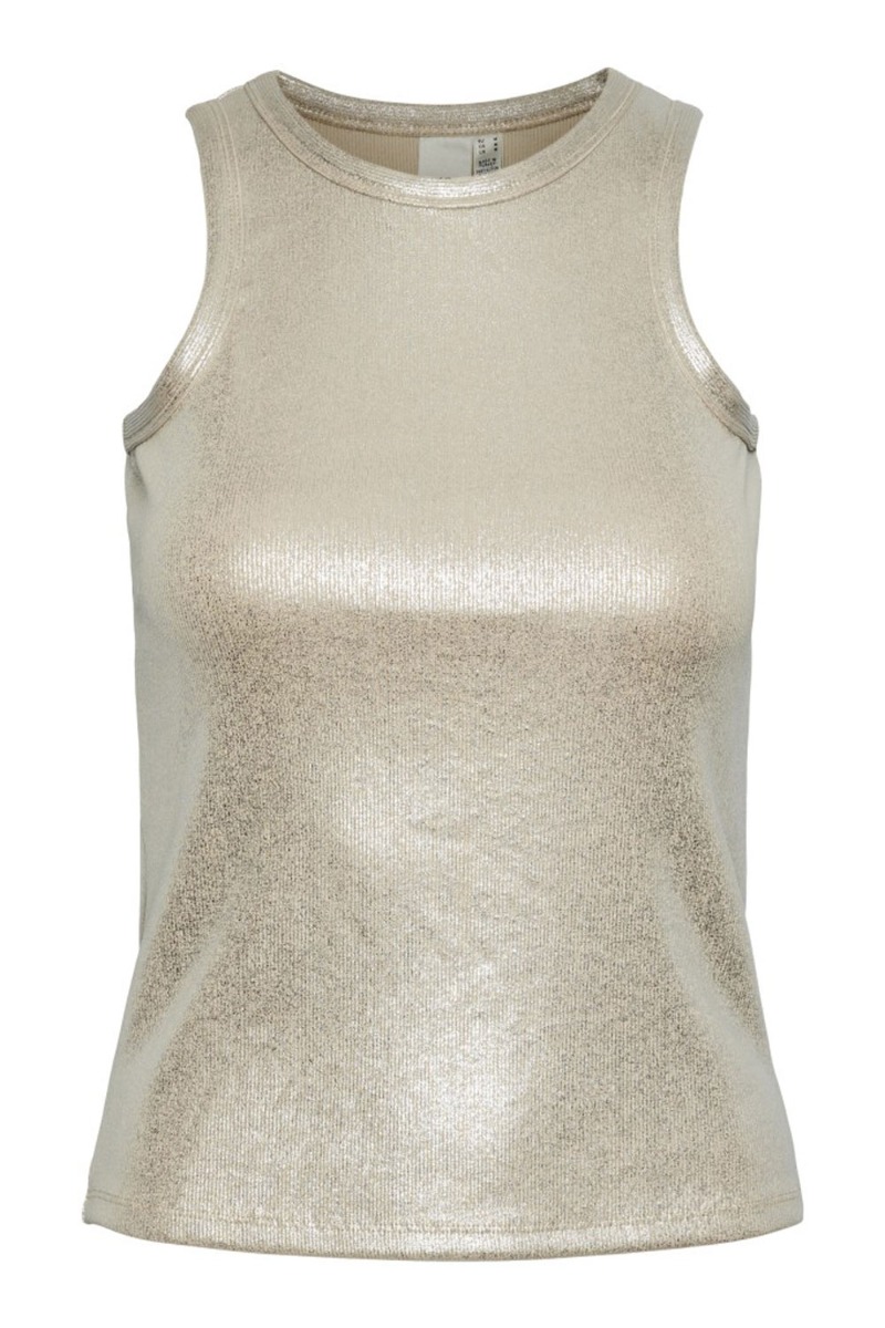 En god top fra Y.A.S i en smuk guld/sølv glimmer foran. Den er i en lækker rib kvalitet og lang nok i modellen til et par den kan side nede i en højtaljet buks. Den er nem at bruge under en blazer eller til en åben skjorte.