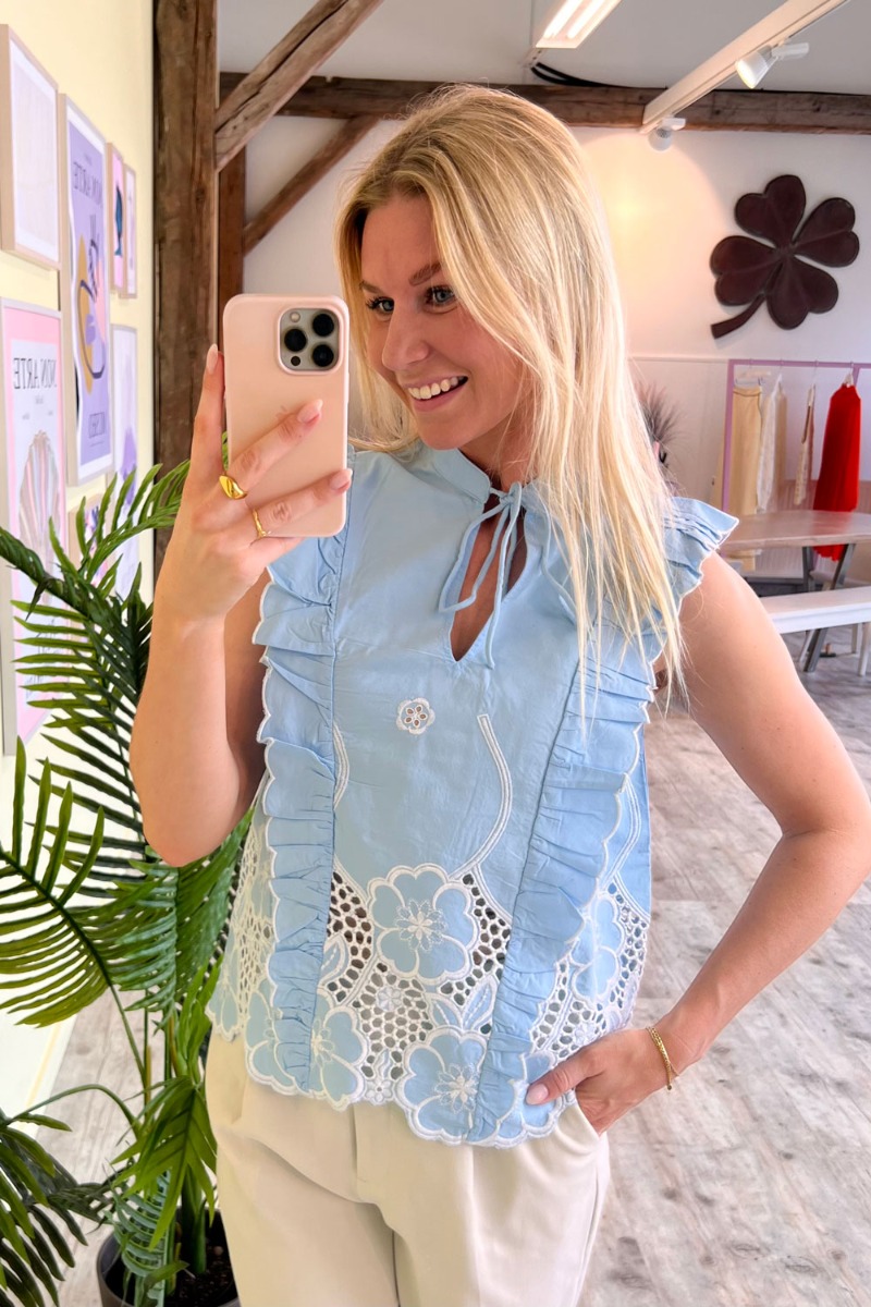 Sød sommertop fra Y.A.S i den fineste lyseblå farve med smukke broderet detaljer der giver en flot kontrast med den hvide. Toppen har flæsedetaljer og snøres i halsen der skaber en lille åbning fortil. Denne top er sød at bruge både til pænt og hverdagsbrug.