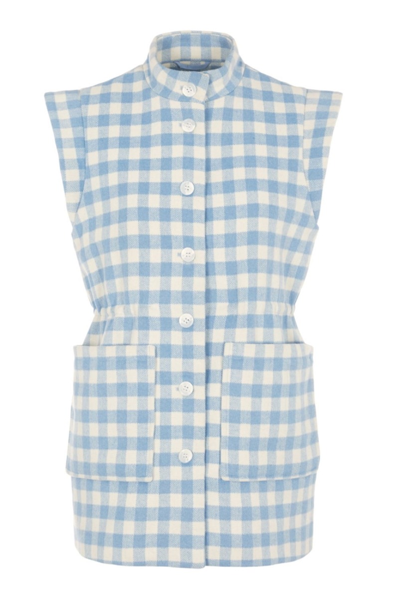 Blå og hvid ternet vest fra Y.A.S med knapper foran og fine flæseærmer. Vesten er perfekt over dine kjoler eller med en strik under til de kolde dage.