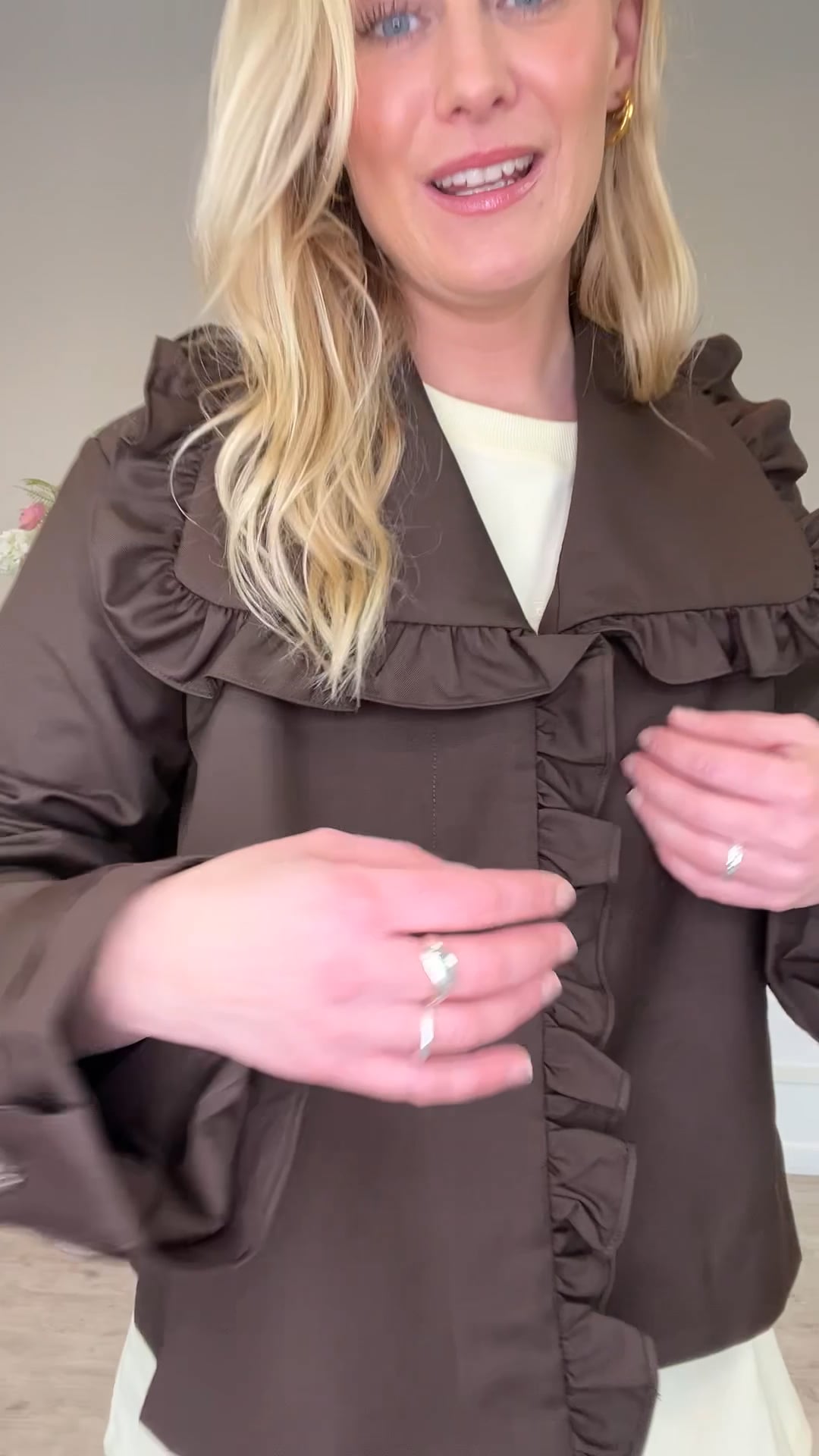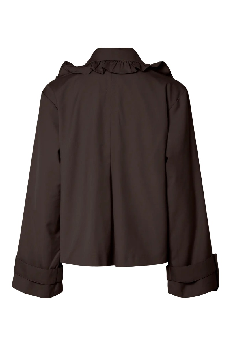 Denne korte jakke fra YAS kombinerer et klassisk udtryk med feminine detaljer. Jakken er designet i en dyb, chokoladebrun farve og har en løs, boxy pasform, som giver et moderne og afslappet look. Det store reverskraveparti er kantet med fine rysler, der fortsætter ned langs fronten og tilfører et romantisk touch. Ærmerne afsluttes med brede manchetter og dekorative knapper, som matcher de to knapper på frontens lommeklapper. En elegant og unik statement-jakke, perfekt til at løfte både hverdags- og aftenoutfits.